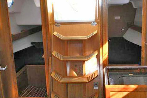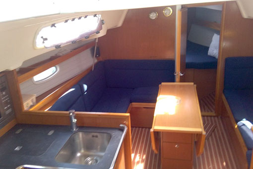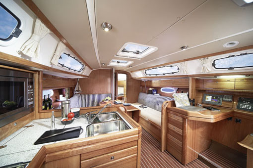 In a change from traditional Bavaria design, the chart table is hinged on the bulkhead facing forward into the saloon by the starboard settee. This is designed to be stowed up to create more seating space.