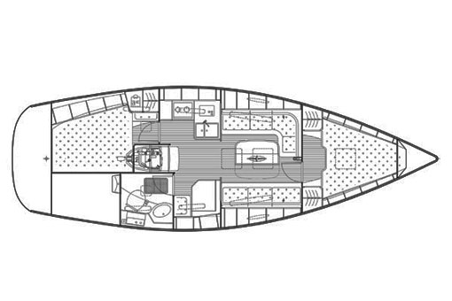 Deck equipment: Electric anchor, windlass, Cockpit table, Cockpit shower, Cockpit speakers, Steering wheel, Dinghy, Outboard motor, Spray-hood, Bimini top