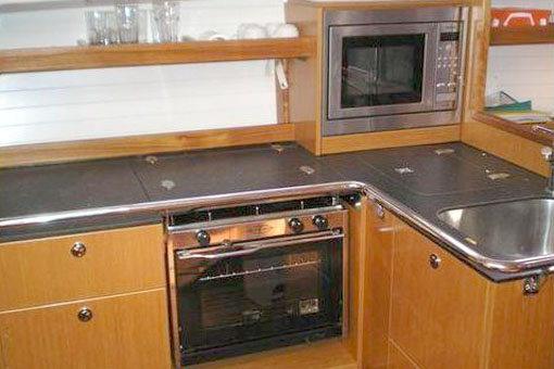 The galley is situated on the port side of the saloon opposite the head and shower, forward of the port aft cabin. A large front-loading fridge has been located under the saloon table. Fridge capacity of this scale has rarely been seen on a 35’ yacht.