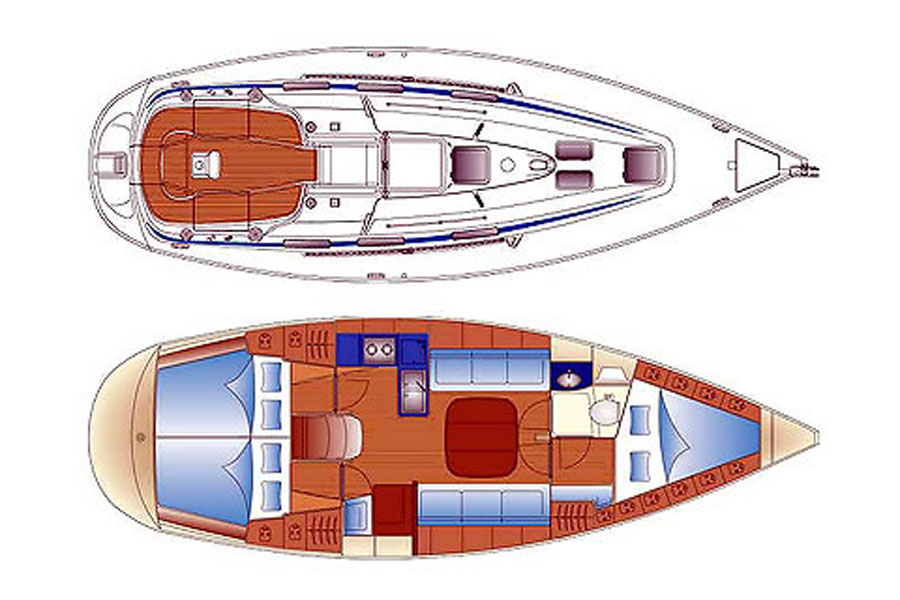 Deck equipment: Electric anchor, windlass, Cockpit table, Cockpit shower, Cockpit speakers, Steering wheel, Dinghy, Outboard motor, Spray-hood, Bimini top