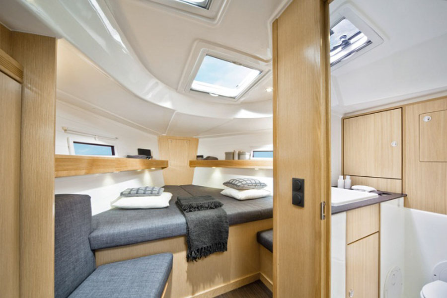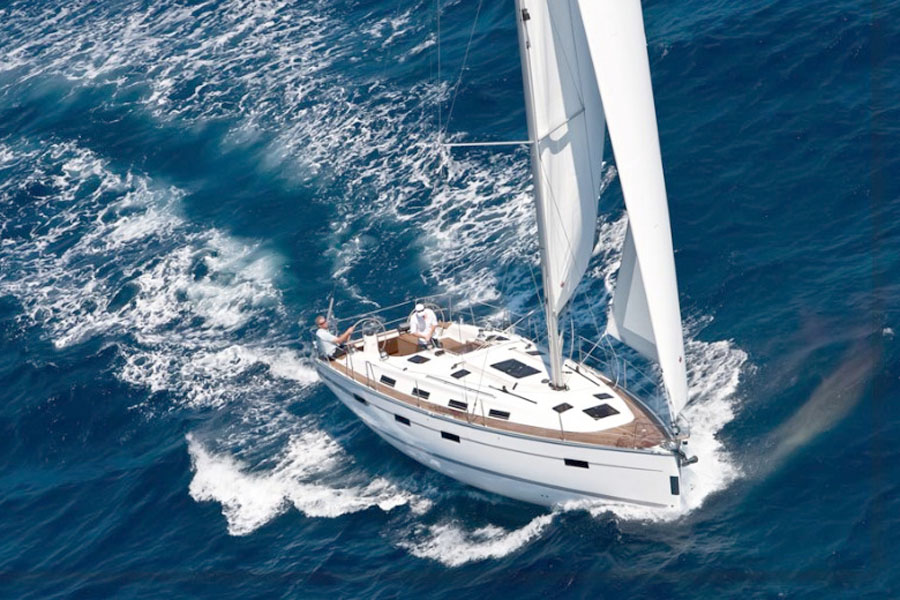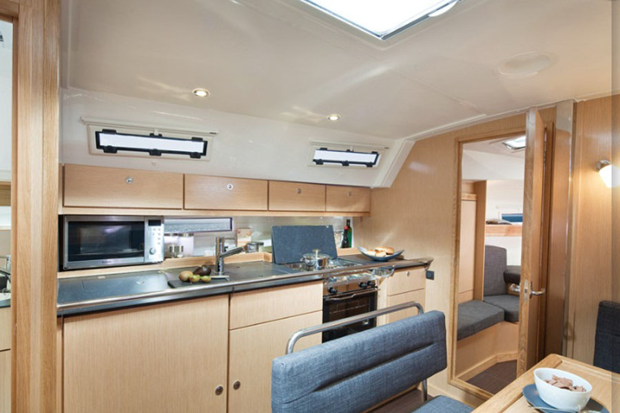 Deck equipment: Electric anchor, windlass, Cockpit table, Cockpit shower, Cockpit speakers, Steering wheel, Dinghy, Outboard motor, Spray-hood, Bimini top.