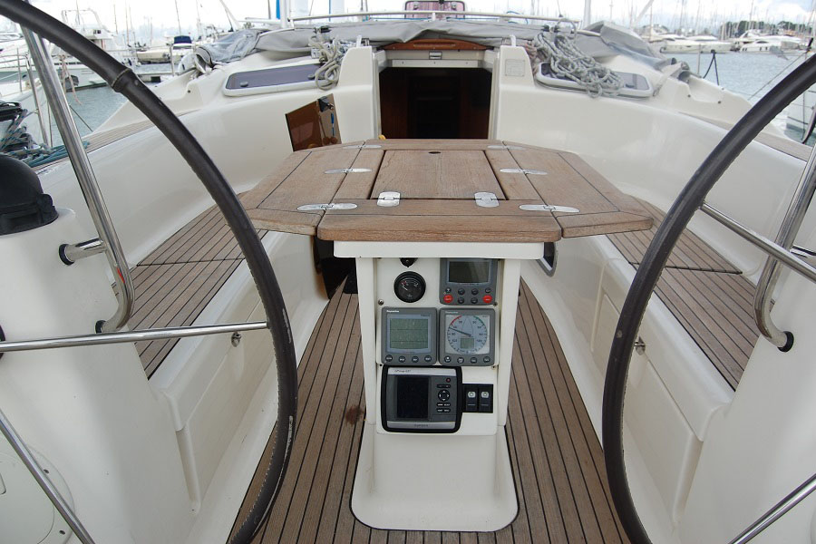 Deck equipment: Electric anchor, windlass, Cockpit table, Cockpit shower, Cockpit speakers, Steering wheel, Dinghy, Outboard motor, Spray-hood, Bimini top