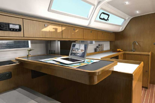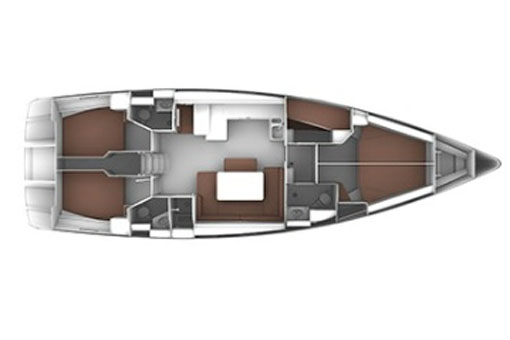 Deck equipment: Electric anchor, windlass, Cockpit table, Cockpit shower, Cockpit speakers, Steering wheel (2), Dinghy, Outboard motor, Spray-hood, Bimini top, Deck shower, Swimming ladder.