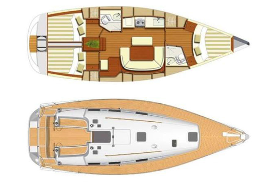 Deck equipment: Electric anchor, windlass, Cockpit table, Cockpit shower, Cockpit speakers, Steering wheel, Dinghy, Outboard motor, Spray-hood, Bimini top