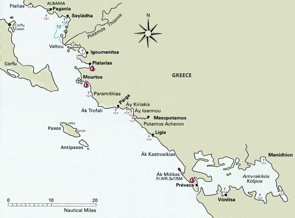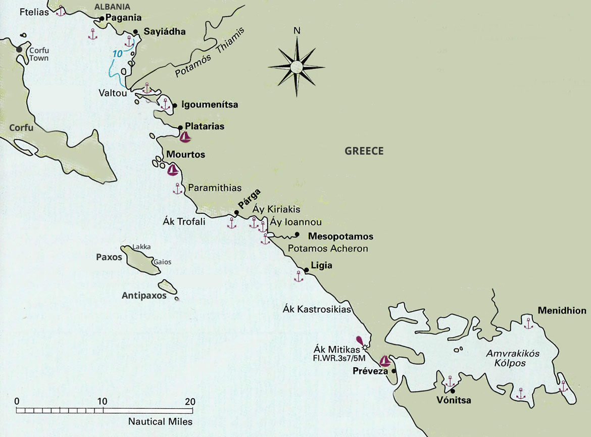 Corfu is the most northerly Ionian island with the attractive Corfu town (Kerkira) and many coves and anchorages as well as the large Gouvia Marina. The relatively remote islands of Paxos and Antipaxos are an absolute delight. Other harbours are on the mainland coast including Preveza, close to the international airport. See chartlet above.
